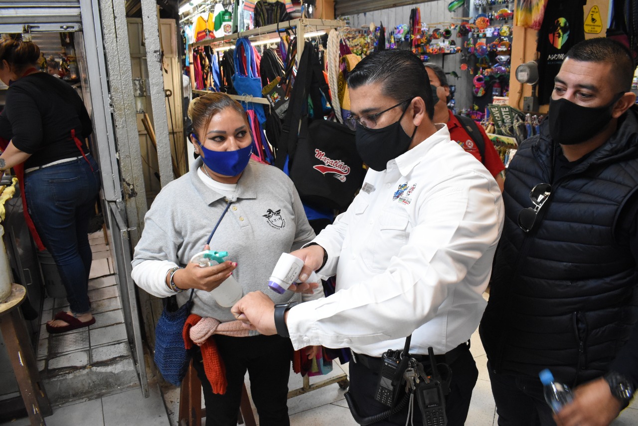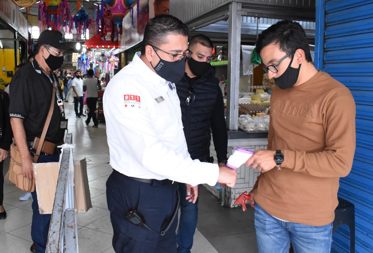En el mercado Pino Suárez, personal del municipio en coordinación con la Unión de Locatarios se dio a la tarea de revisar en cada uno de los accesos la toma de temperatura y la aplicación de gel anti bacterial.