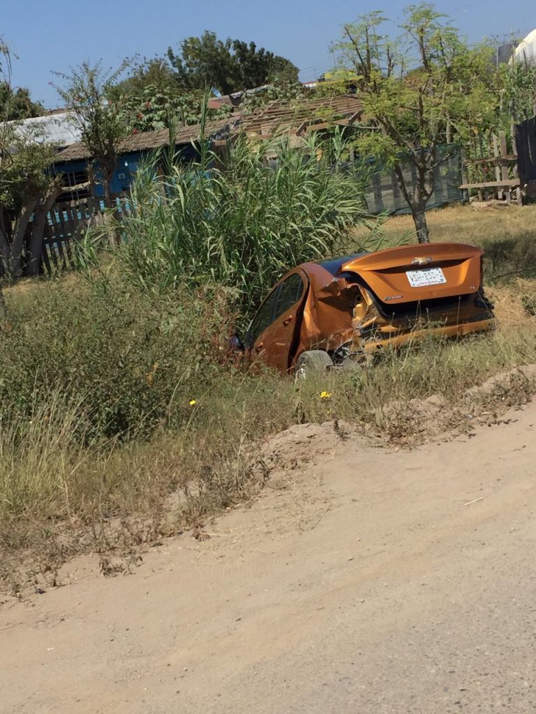 Datos proporcionados por el conductor refieren que una camioneta, de la cual se desconocen las características, le salió al paso de una calle de terraceria, golpeando este la parte trasera del automóvil Chevrolet Sonic color salmón, provocando esto que el carro diera volteretas hasta terminar en el fondo de un canal de la zona.