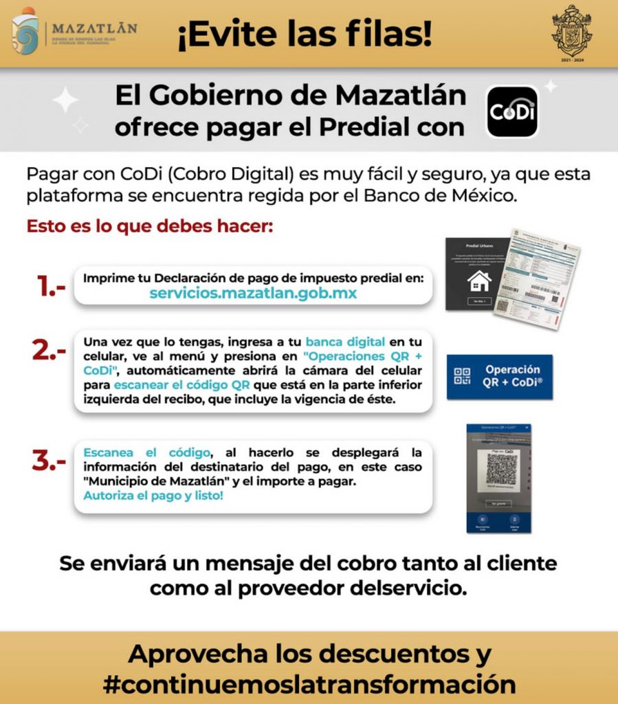 Evite las filas, el Gobierno de Mazatlán ofrece pagar el Predial con CoDi