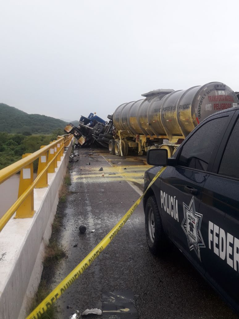 Rosario, Sinaloa.- Tras el choque entre dos tractocamiones alrededor de las 8:45 de la mañana de este viernes, sobre la autopista Tepic-Mazatlán, justo sobre el Río Baluarte, uno cargado con dos cisternas de diesel y un trailer con agroquímicos, se presentó fuga de combustible, mismo que fue a parar al Río Baluarte.