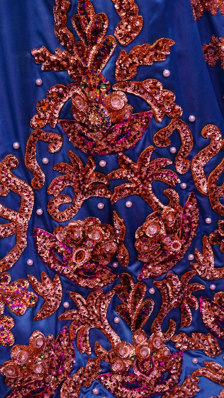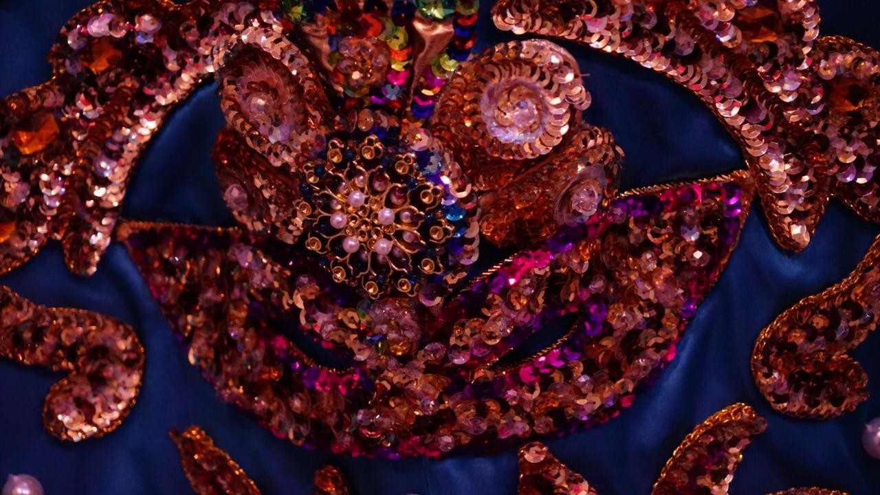 Este traje fue confeccionado con tela tafeta con seda italiana importada de Europa, además de que lleva lentejuela, cristal checoslovaco, abalorios, vidrio y mucho relieve en 3D técnica nueva para que resalte los antifaces que están en la vestimenta.